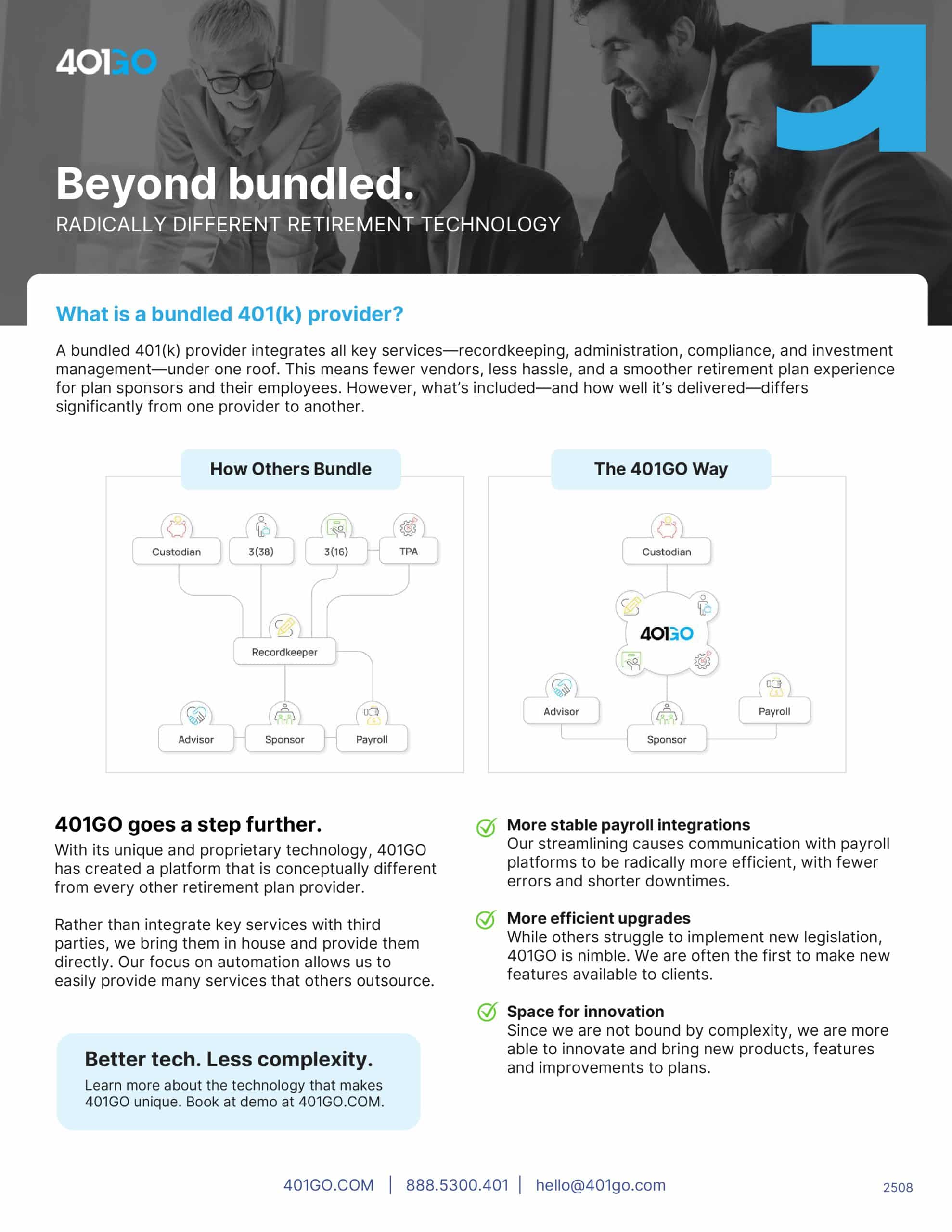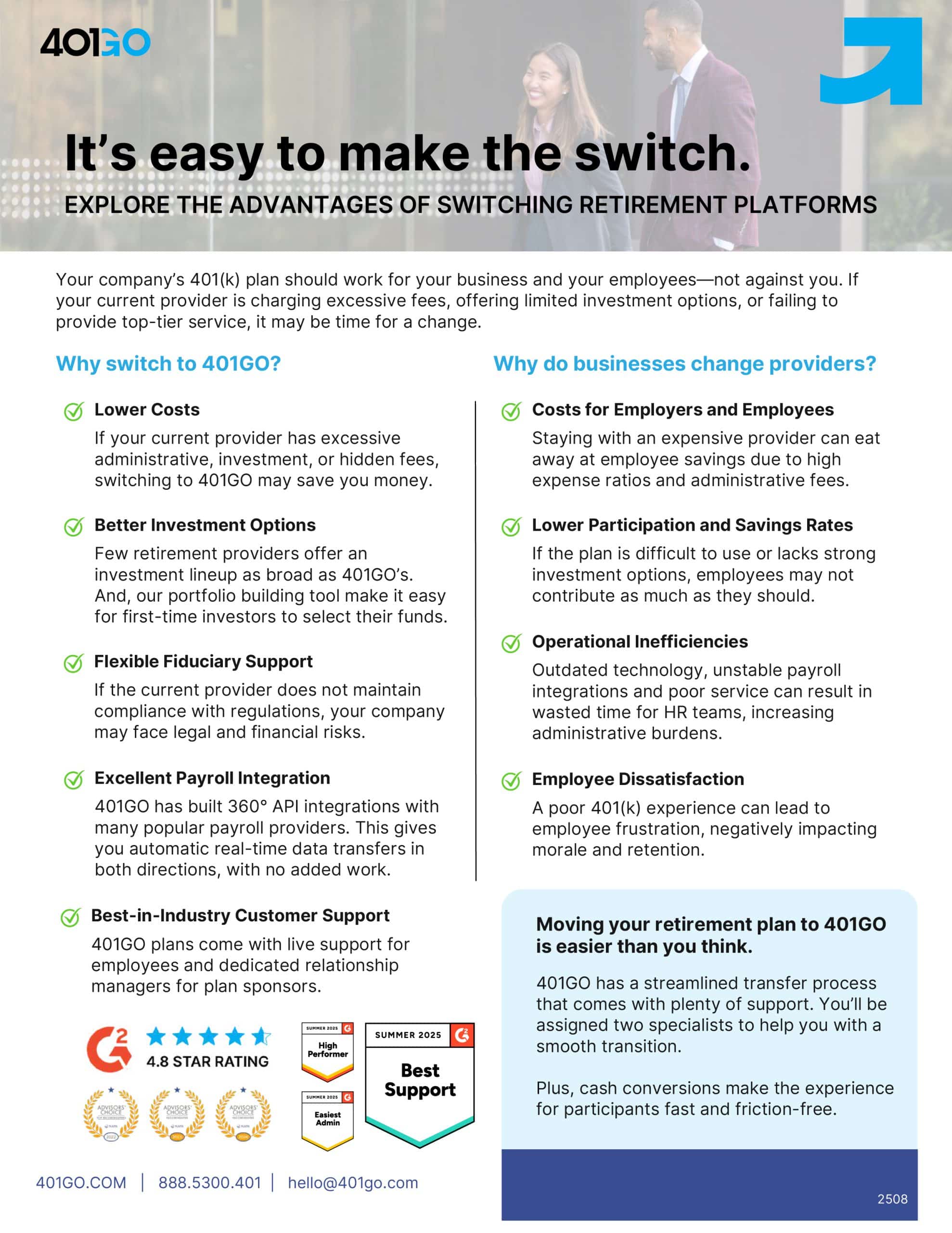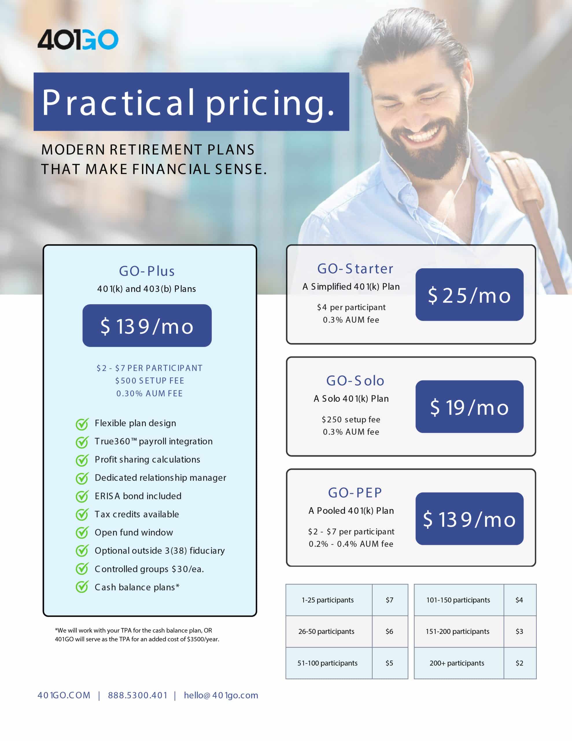 This means your company’s retirement plan will go to the highest bidder—unless you proactively choose your own. Providers like 401GO offer seamless integration with your payroll software, can be set up in 15 minutes and require less than 5 minutes per month of plan maintenance.