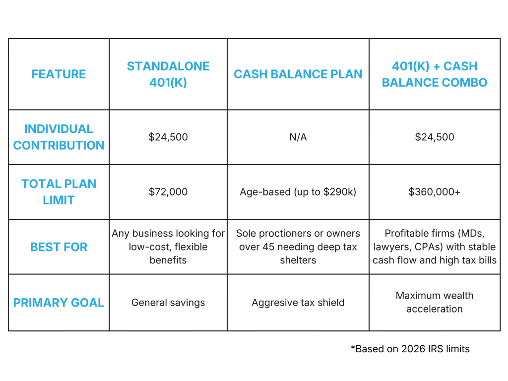 Combining a cash balance and profit-sharing 401(k) plan is a favorite strategy for high-income earners and professional service firms (like doctors or lawyers) for a few reasons: