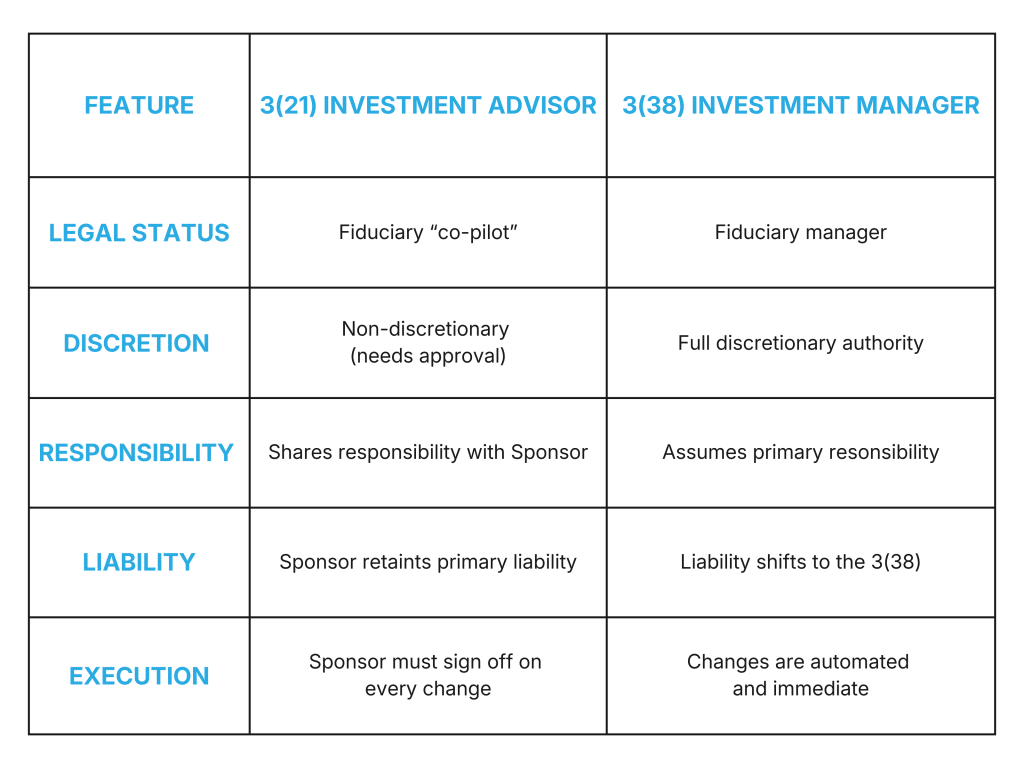While a 3(21) advisor must wait for a signed approval from a busy business owner to swap a lagging fund, a 3(38) has the authority to act immediately on the plan’s behalf.